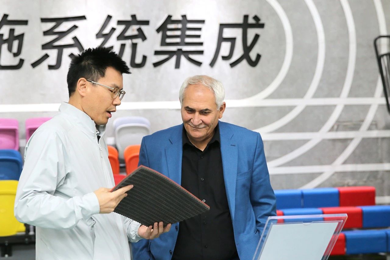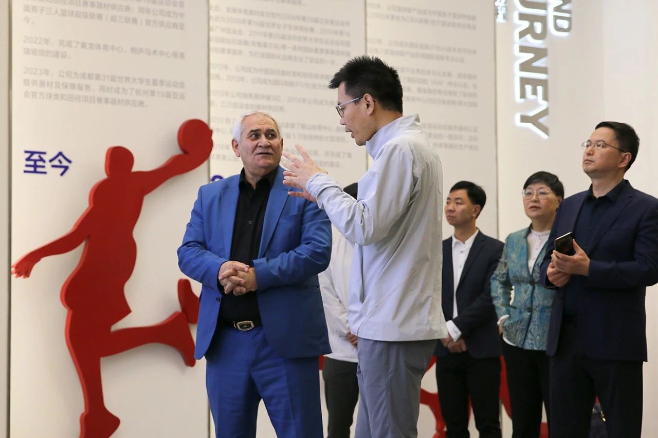穆哈邁德·扎路主席一行在國家體育總局舉摔柔中心主任劉成亮、蘇州市體育局副局長程軍紅、張家港市文體廣旅局局長周穎和金陵體育總經(jīng)理李劍剛的陪同下,參觀了公司數(shù)字化展廳、產(chǎn)品展示館、智能化制造車間、檢測(cè)中心和金陵洲際文體,詳細(xì)了解了金陵體育的發(fā)展歷程、業(yè)務(wù)版圖以及智能化球館、籃球租售終端等數(shù)字化、網(wǎng)絡(luò)化、智能化技術(shù)下的創(chuàng)新模式和落地成果。